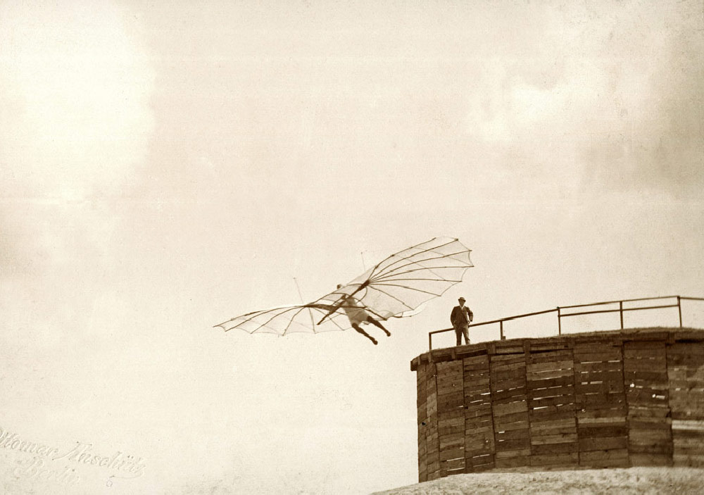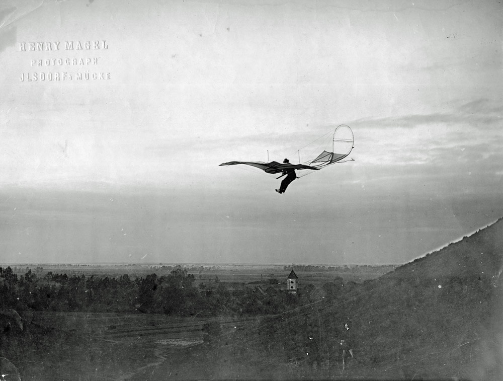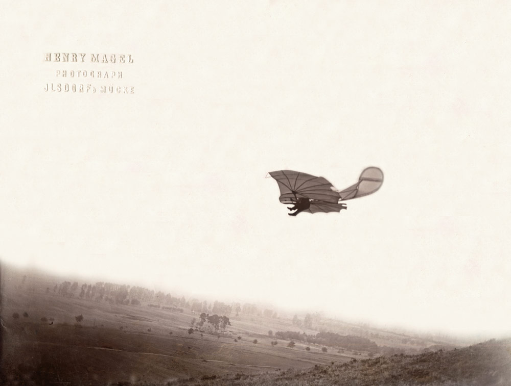 Lilienthal’s jump from his flight station on top of Maihöhe in Steglitz, 1893, photograph, Ottomar Anschütz